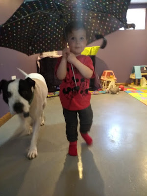 Preschool means bus stop, which means Jade's first babywearing umbrella experience.
